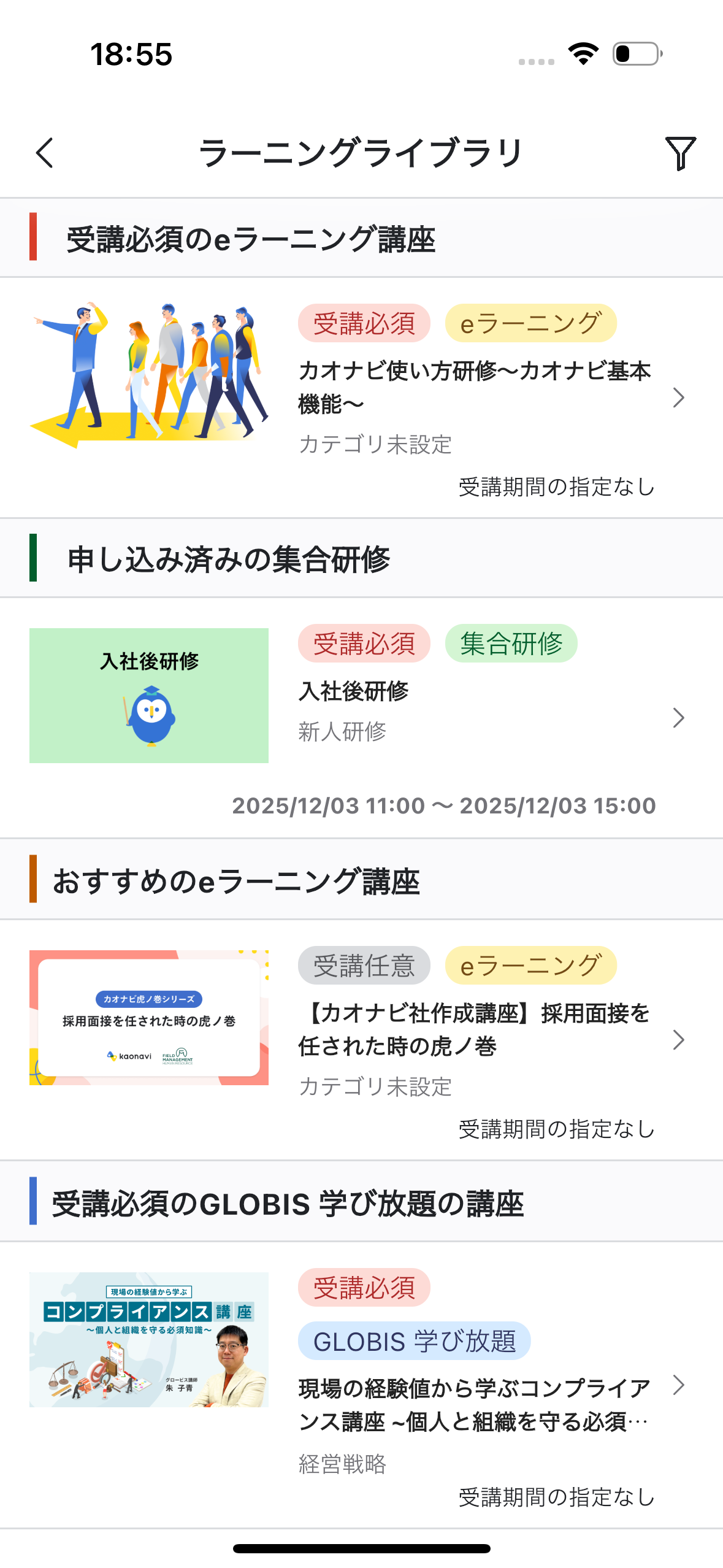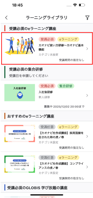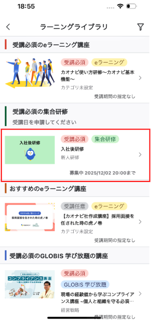 ラーニングライブラリを開き、受講したい集合研修をタップします。
