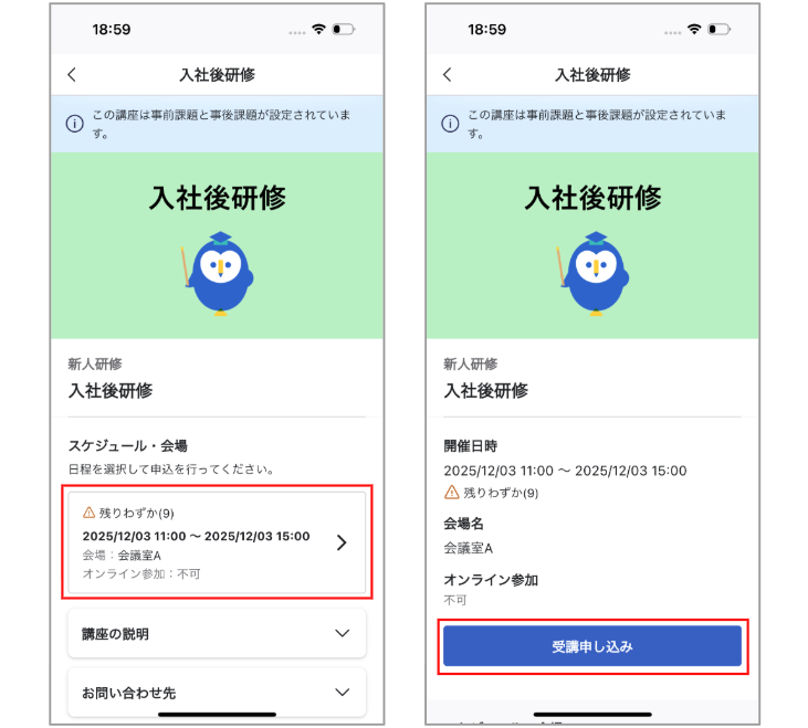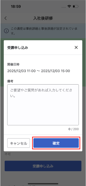 研修日程を選び、選ぶと『受講申し込み』ボタンが表示されるのでタップします。