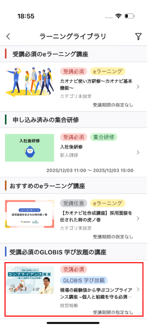 ※アプリではラーニングライブラリの『プリセット講座』は非対応となります。プリセット講座を公開している場合講座一覧に表示されますが、講座を受講することはできません。