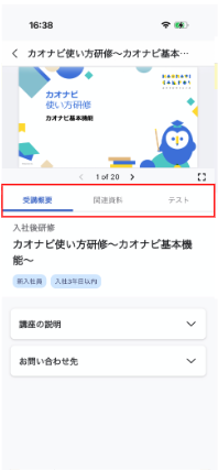 講座詳細画面を講座内の項目ごとにタブで切り替えれるようにしました。これにより、教材やテストなど閲覧したい項目に少ないスクロールで素早くアクセスできるようになります。